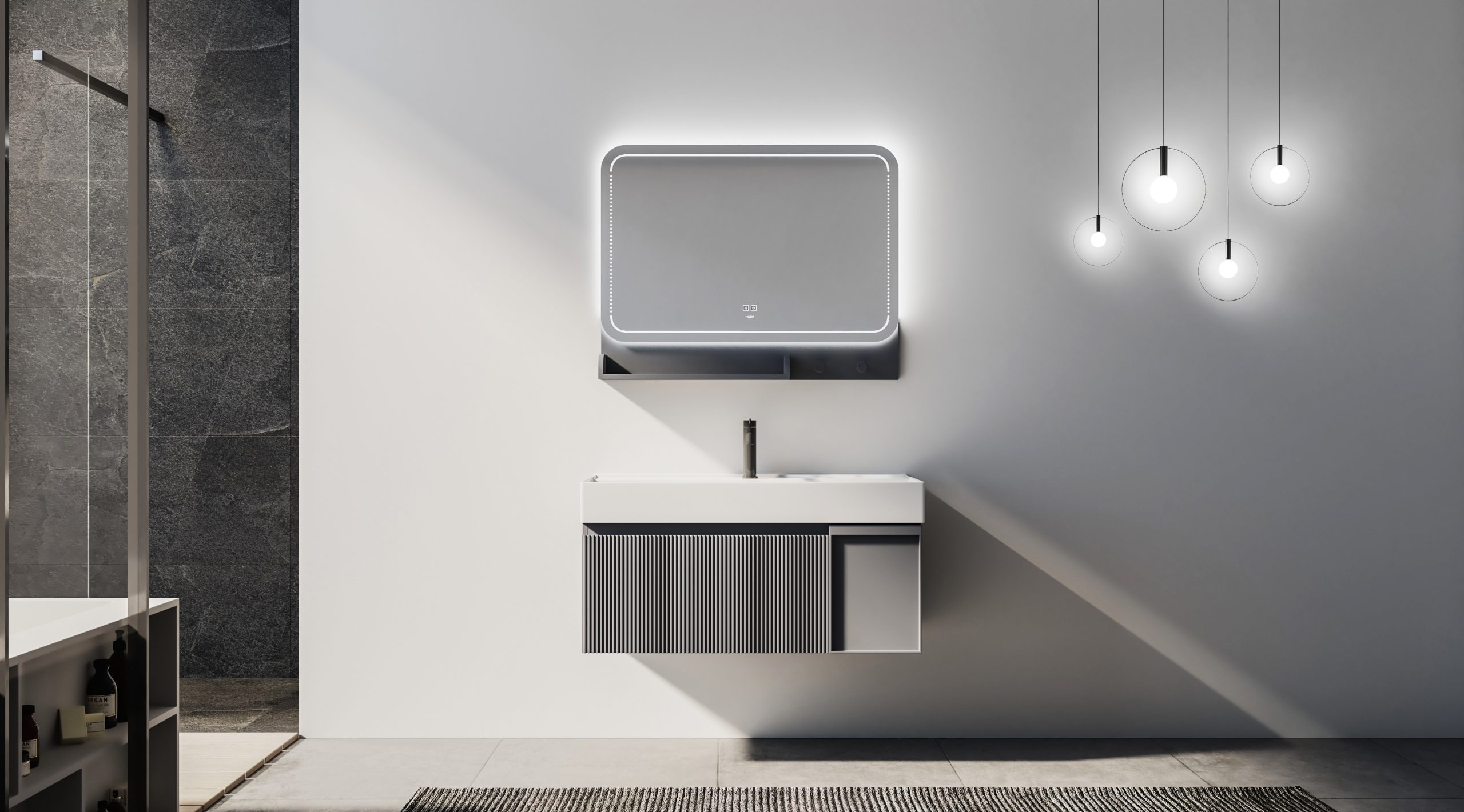 第三代无铜环保镜片,背面四周发光+正面磨砂圈发光,LED 灯+除雾+触摸开关+三色无极调光